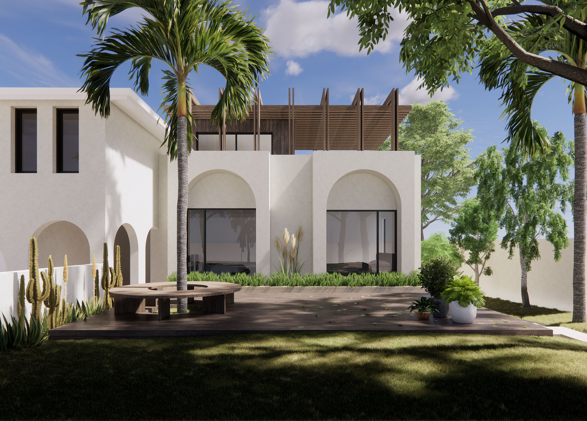 Extension and alteration project for a 5-bedroom multi-generation house in leafy northern Sydney suburb. The design embraces the classical arch reference from the existing house and responds to the landscaping in the context, offering tree-top experience with bespoke roof terrace design.